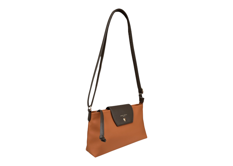 A soft bag designed with a front flap popper and top zip closure. Finished with long material adjustable handle.