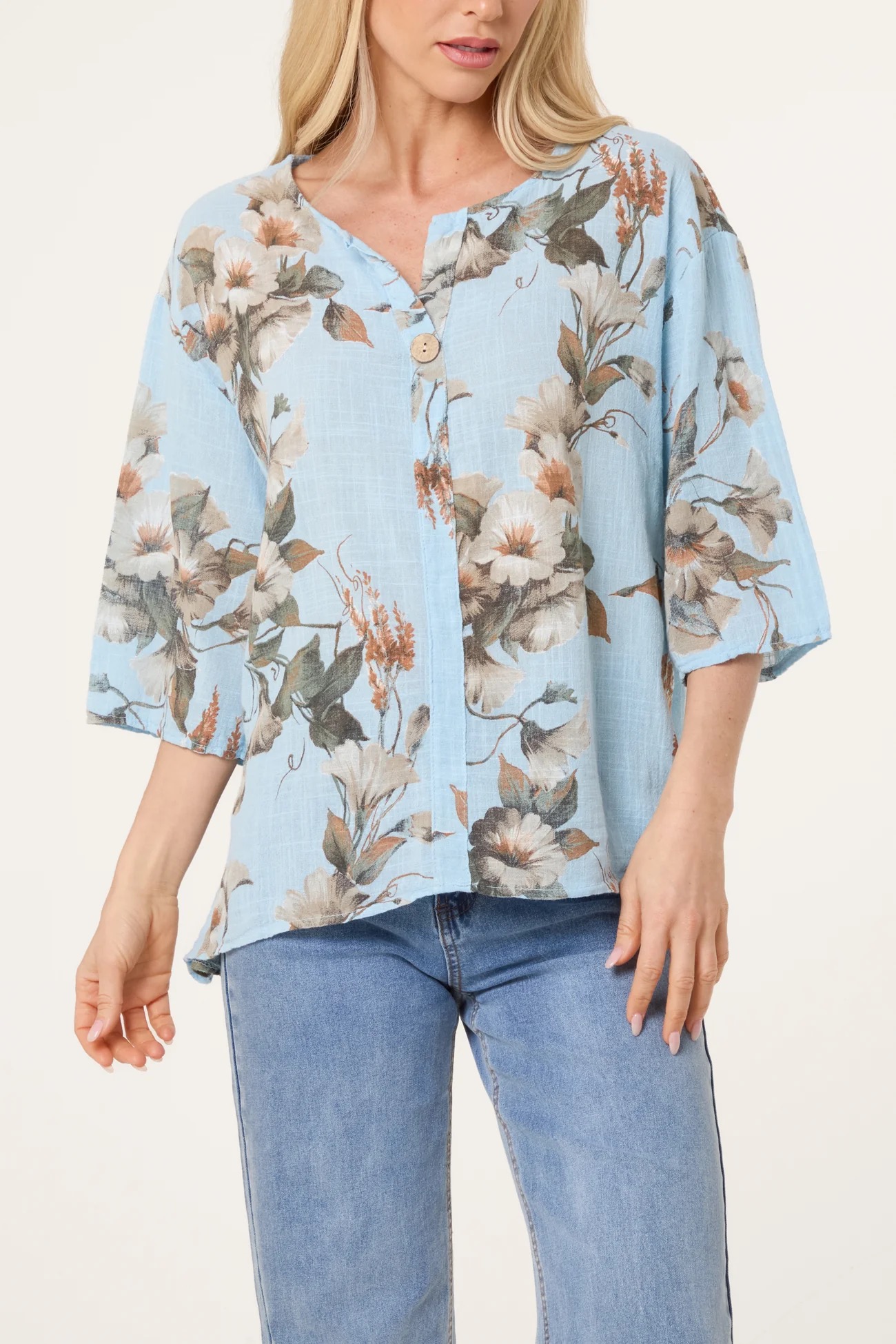 Gorgeous loose cotton blouse featuring a single button detail. The sleeves are 3/4 length, perfect for covering up on warm days. Its longer at the back and looks great tucked in or left loose.